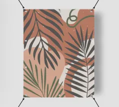 Foglie stilizzate in nero e verde si stagliano su uno sfondo di strisce curve e fluide in morbide tonalità di terra. Il disegno combina elementi botanici con forme geometriche astratte per un look moderno.