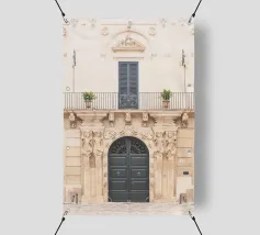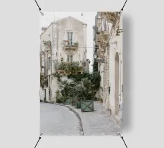 Scena di strada nell'antica città di Siracusa. Molte piante e alberi ricoprono gli antichi edifici di questa strada.