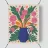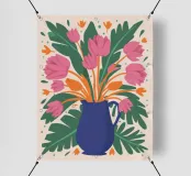 Un vibrante bouquet di tulipani rosa in un vaso blu scuro, dipinto in un audace stile di ispirazione fauvista. I colori espressivi e i contorni decisi creano una natura morta floreale potente ed energica.