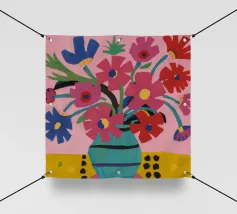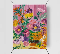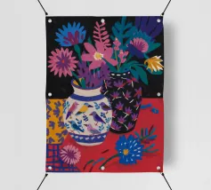 Una vibrante ed eclettica natura morta con un bouquet di fiori in due vasi con motivi diversi, uno a macchie e uno a ghirigori. La tovaglia a motivi aggiunge un mix gioioso e massimalista di colori e design.