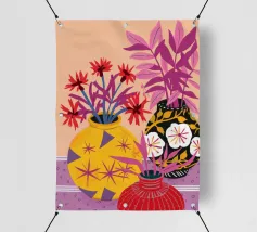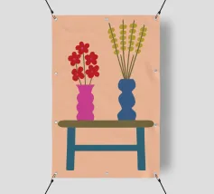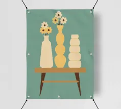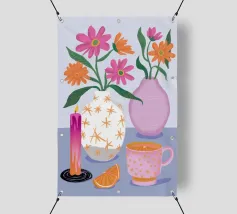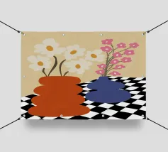 Un'affascinante natura morta di un semplice bouquet di fiori bianchi e arancioni in un vaso, seduto su un tavolo con una tovaglia a scacchi rossi e bianchi. La scena ha un'atmosfera calda, rustica e leggermente nostalgica.