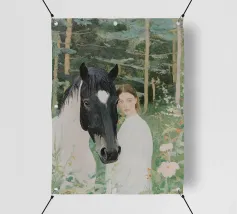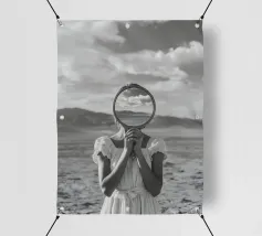 Un'immagine surreale in bianco e nero di una donna in abito di pizzo che si trova di fronte a una gigantesca testa di cavallo con texture screpolate, che crea un'atmosfera onirica e stimolante in un cielo nuvoloso.