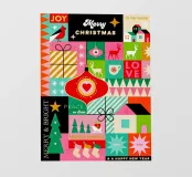 Celebrate la magia della stagione con questa vivace e festosa opera d'arte! Caratterizzato da un allegro mix di forme grafiche e simboli iconici delle festività - tra cui renne, baubles, calze, alberi di Natale, stelle, case, regali, slitte e altro ancora - questo disegno esplode di colori vivaci e di allegria natalizia.