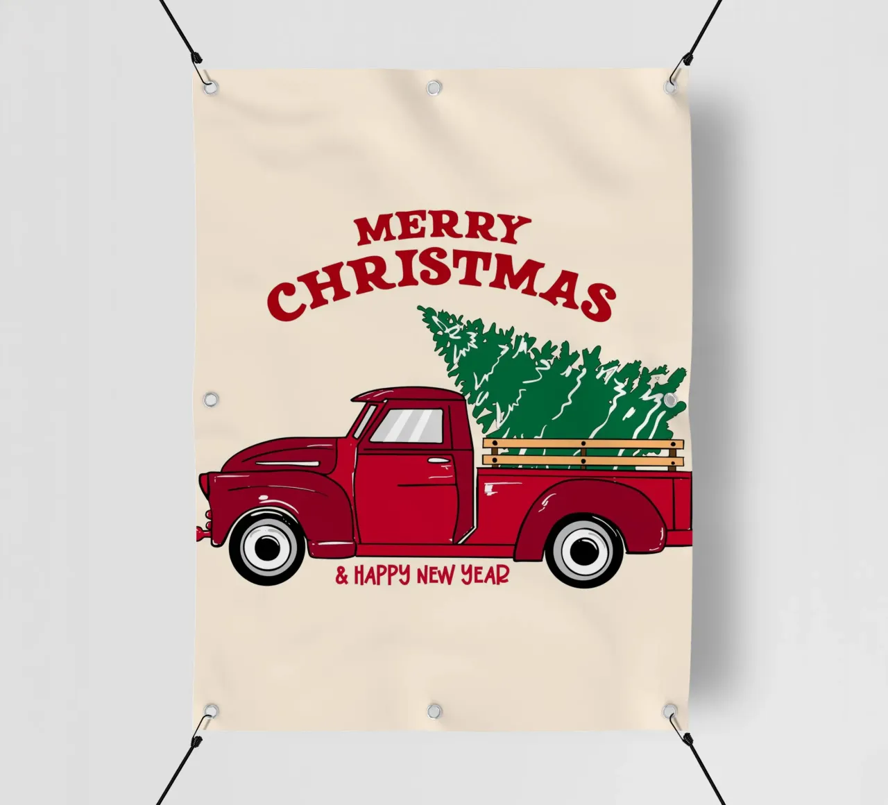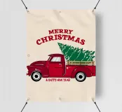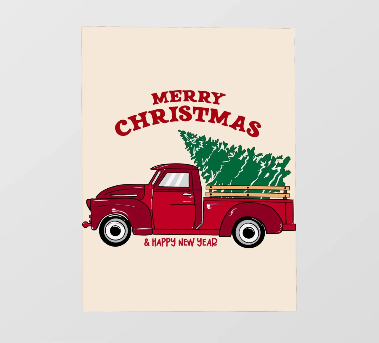 Classico camioncino rosso che trasporta un albero di Natale, perfetto per progetti festivi, vintage e per le feste.