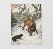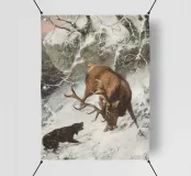 Un impressionante dipinto realistico mostra il drammatico incontro tra un possente cervo e un cane da caccia tra le montagne innevate. La scena cattura la tensione, la selvaticità e il dinamismo della caccia, magistralmente realizzata con luci e dettagli raffinati. Lo sfondo invernale con rocce e rami spogli enfatizza la drammaticità della situazione. Un classico motivo di caccia per gli amanti della pittura animale tradizionale e dell'arte naturalistica realistica.