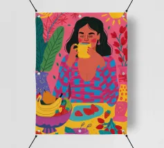 Vista dall'alto di una semplice colazione su una tovaglia a scacchi rossi e bianchi, con una tazza di caffè e un ramo d'albero. La composizione minimalista ha un'atmosfera serena, grafica e classica da caffè.