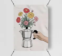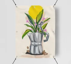 La classica caffettiera Moka è elegantemente presentata come un vaso che contiene una singola e delicata margherita bianca, unendo i rituali del caffè e la bellezza della natura in una natura morta minimalista.