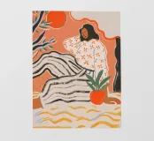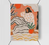 Una donna siede rilassata al centro di una luminosa tonalità di arancione. Il suo vestito a righe e il suo top floreale sembrano un mix di illustrazione di moda e arte moderna. Linee decise, colori caldi e un'ambientazione stilizzata fanno oscillare questo quadro tra serenità e forza. Una composizione che celebra la femminilità, la calma e la forza allo stesso tempo, ispirata alla grafica moderna e all'atmosfera mediterranea.