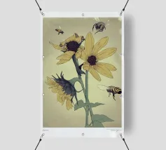 Questa illustrazione luminosa e allegra mostra un vivace campo di girasoli visitato da api ronzanti. I grandi fiori sono in piena fioritura e simboleggiano l'estate, la gioia di vivere e la crescita. Le api in volo sottolineano la naturalezza e il movimento della scena. Ideale per chi ama i motivi floreali o cerca un legame con la natura. Perfetto per cucine, soggiorni, spazi di lavoro o come regalo per gli amanti dei fiori. Quest'opera può avere anche un fascino particolare per chi è attento all'ambiente o per gli apicoltori.