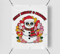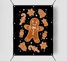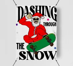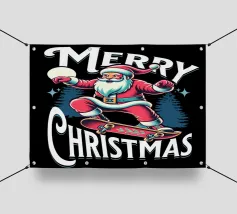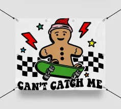 Un omino di pan di zenzero che indossa un cappello da Babbo Natale va allegramente in skateboard. La scritta "Can't Catch Me" aggiunge un tocco giocoso sopra il personaggio.