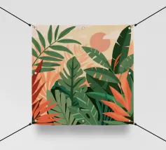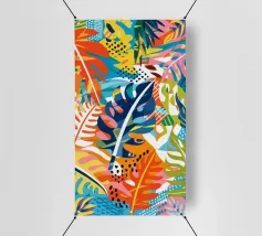 Un'esplosione caotica e cromatica di foglie colorate e sovrapposte crea un modello di giungla vibrante, energico e coinvolgente, pieno di vita e movimento.