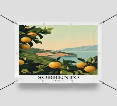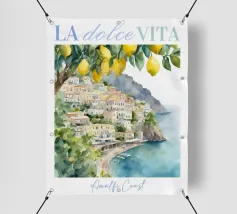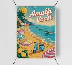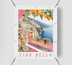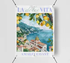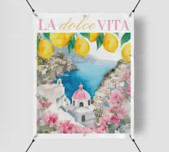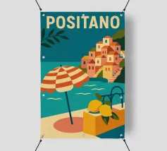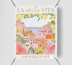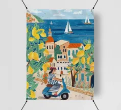 Celebrate la dolce vita con questa vivace stampa d'arte a collage ispirata a Capri, in Italia. Un incantevole dipinto di un villaggio di mare è incorniciato da allegri motivi di agrumi, uno scooter retrò e un cactus con gli occhiali da sole, il tutto stratificato con audaci forme astratte in arancione, magenta e verde acqua. È il pezzo perfetto per tutti coloro che desiderano le vibrazioni mediterranee, l'estetica retrò e l'eccentricità dell'arredamento ispirato ai viaggi.