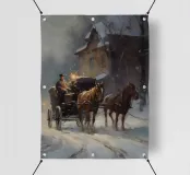 Questo suggestivo dipinto mostra una carrozza trainata da cavalli che percorre una strada innevata, mentre la calda luce delle lanterne illumina la sera. Il cocchiere, in spessi abiti invernali, guida i cavalli con calma nella notte gelida. Una scena piena di nostalgia, romanticismo e tranquillità invernale, che trasporta lo spettatore in un'epoca passata ricca di fascino e contemplazione.