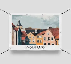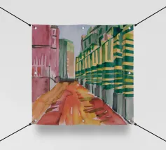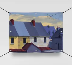 Un'energica veduta dall'alto cattura una cascata di tetti colorati, gialli, rossi e blu, che si contendono lo spazio. Il dipinto è una celebrazione vibrante, quasi astratta, della trama densa e vivace di una vecchia città.