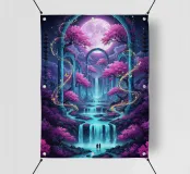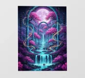 Cascata incantata al chiaro di luna. Un paesaggio surreale caratterizzato da cascate sotto una grande luna luminosa. Alberi di ciliegio in fiore con fogliame rosa vibrante arricchiscono la scena.