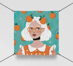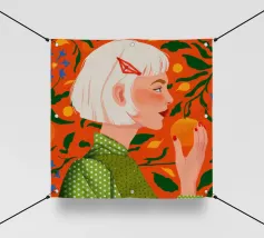 Questo pezzo ritrae una donna seduta accanto a una mezzaluna, che indossa una veste blu e argento. Lo sfondo viola intenso, ornato di stelle, evoca una serenità celestiale.