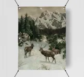 Un suggestivo motivo invernale: tre cervi si ergono maestosi in un paesaggio montano innevato, con abeti e cime sullo sfondo. I colori naturali e l'atmosfera tranquilla rendono questo disegno perfetto per gli amanti della natura e degli animali. Che si tratti di un murale, di un cuscino, di una tazza o di un poster, questo motivo porta il romanticismo invernale della fauna selvatica, l'eleganza e la tranquillità in ogni casa.