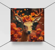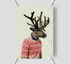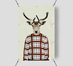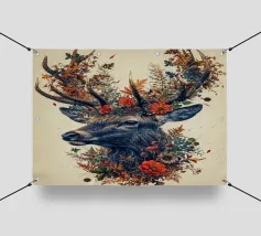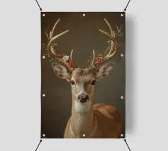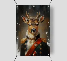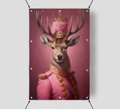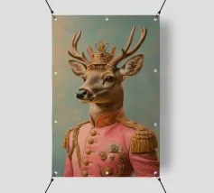 Un ritratto surreale di un uomo con la testa di cervo, vestito con un elegante abito vintage, in piedi in una foresta buia. Una fusione di natura selvaggia e moda raffinata