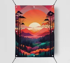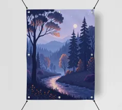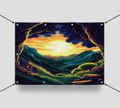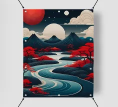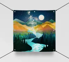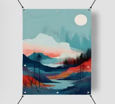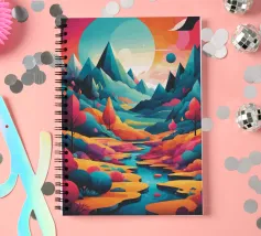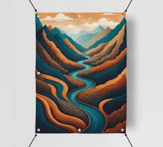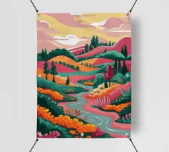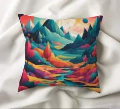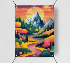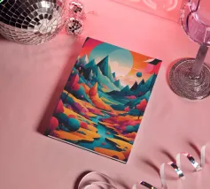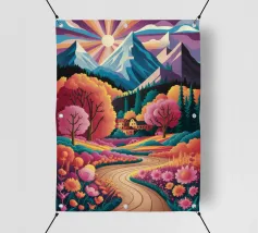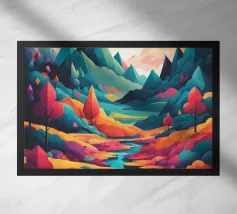 Si apre un paesaggio ipnotico, dove cime imponenti trafiggono un cielo pieno di sfere di luce. La scena è un tripudio di colori, con sfumature di arancio, rosa, blu e viola che si fondono senza soluzione di continuità. L'uso di linee spigolose e taglienti accostate a forme morbide e arrotondate crea una tensione visiva accattivante. Un fiume tranquillo si snoda nella valle, riflettendo i colori vibranti che la sovrastano. Quest'opera invita lo spettatore a esplorare un mondo in cui colore e forma danzano in perfetta armonia.