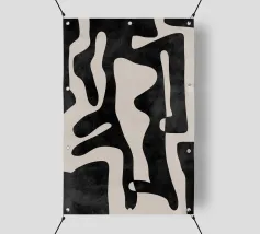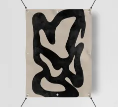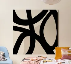 Una potente rete di linee nere che si piegano e si intersecano, come flussi di pensiero contrastanti su uno sfondo neutro. La composizione ricorda l'astrazione gestuale, con echi di Franz Kline e dell'arte dell'inchiostro giapponese. Nonostante l'austerità della tavolozza dei colori, si sviluppa una dinamica espressiva. Un'opera che trae tensione dalla riduzione e carica lo spazio di pura energia visiva. Anche su tessuti.