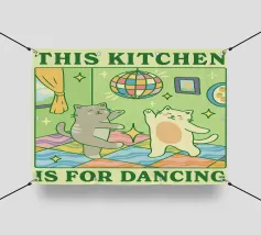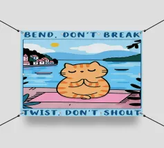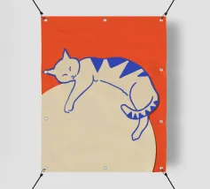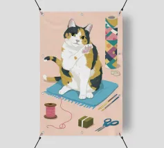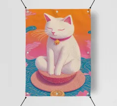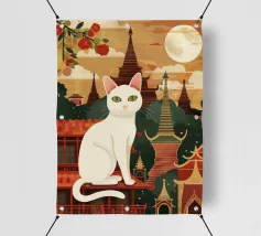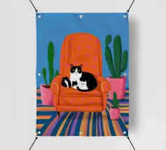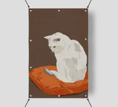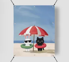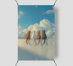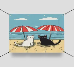 Un'ambientazione serena sulla spiaggia presenta un gatto seduto su cuscini impilati insieme ad altri due gatti, tutti intenti a guardare il tramonto. Le tonalità tenui e l'atmosfera pacifica evocano tranquillità e unione.