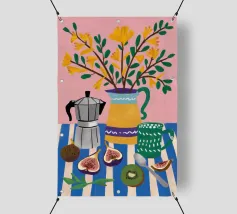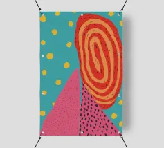 Una moderna composizione astratta con archi color terracotta, forme blu strutturate e linee organiche. L'opera d'arte fonde l'estetica bohémien con elementi minimalisti e astratti per un pezzo equilibrato e di tendenza.