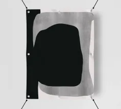 Al centro domina una grande forma ovale nera, circondata da un arco scuro semitrasparente appollaiato su una superficie grigia strutturata. Lo sfondo è di un beige tenue, che crea un netto contrasto con le forme astratte e audaci.