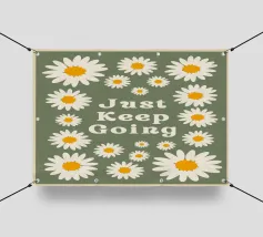 Questa vivace e allegra opera d'arte digitale presenta il messaggio incoraggiante "KEEP GROWING" impilato verticalmente in un carattere bianco sporco di ispirazione retrò su uno sfondo arancione deciso. Un fiore rosa stilizzato con un centro giallo brillante e due foglie gialle aggiunge un tocco di natura e ottimismo al disegno. L'estetica complessiva è positiva ed edificante e promuove i temi dello sviluppo personale e della prosperità.