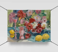 Un'audace natura morta con vivaci fiori rosso-rosa, forse papaveri o gerani, in un semplice vaso, accanto a fresche pere verdi, il tutto su una ricca tovaglia rossa che contrasta nettamente con uno sfondo blu intenso.