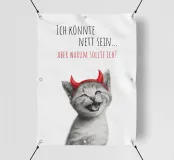 Questo gatto dice quello che tutti noi pensiamo a volte. Con il suo sorriso impertinente e le sue piccole corna rosse da diavolo, mette subito di buon umore; perfetto per chi ama l'umorismo, l'ironia e una dose di fiducia in se stesso. Il design moderno e minimalista colpisce per il suo chiaro disegno in bianco e nero e per l'accento di colore rosso; semplice, ma con un effetto wow. Il design minimalista fa sì che il gatto e lo slogan siano al centro dell'attenzione. Un must per tutti i fan dei gatti di carattere o per chi vuole mostrare il proprio lato sfrontato con stile.