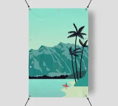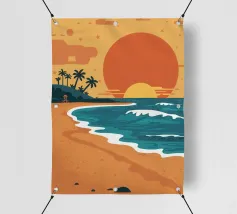 Un poster di viaggio in stile vintage raffigura una serena scena di spiaggia con palme e montagne, con il testo "Picasso", che evoca una fuga nostalgica e artistica verso la costa.