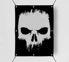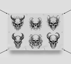 Diversi teschi sono appesi in una ragnatela di ragnatele e rami spinosi. La scena è in bianco e nero e appare oscura e misteriosa per la ricchezza dei dettagli. Un motivo a metà tra l'incubo e l'opera d'arte.
