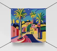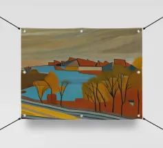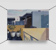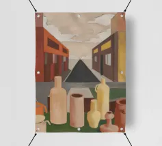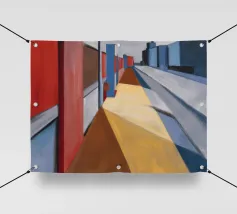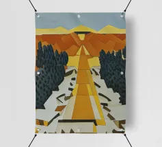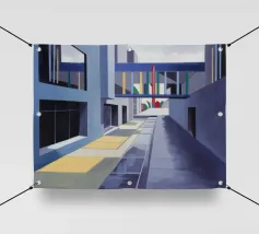 Un sentiero giallo brillante si snoda elegantemente attraverso un paesaggio minimalista di edifici grigi e squadrati. Il dipinto è uno studio sul contrasto dei colori e sulle forme geometriche pulite, che creano una scena urbana serena ma di grande impatto visivo.