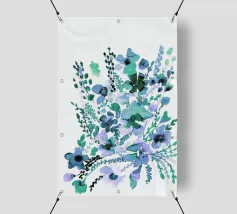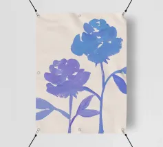 Quest'opera d'arte presenta una delicata disposizione di forme floreali astratte, dipinte con acquerello indaco. I fiori appaiono sparsi lungo una sottile e sinuosa liana che attraversa verticalmente la composizione. I petali variano nella tonalità di colore, da un tenue slavato a un blu intenso, creando un senso di movimento e di ritmo organico sullo sfondo neutro.