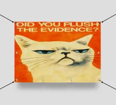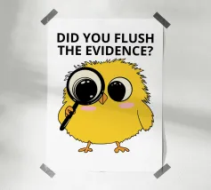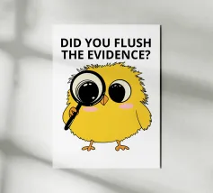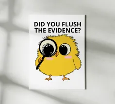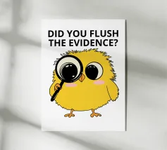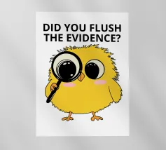 Un simpatico pulcino giallo tiene in mano una lente d'ingrandimento e chiede ironicamente: "Hai buttato via le prove?" con occhi spalancati e un'espressione giocosa. Il disegno combina elementi di mistero e di umorismo, attirando il senso di curiosità.