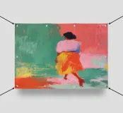 Dipinto a olio di una donna in gonna e camicia bianca, vista da dietro. Rosa pastello, verde acquamarina e arancione brillante, pennellate decise, sfondo minimalista. Stilisticamente ricorda Matisse e gli anni '50, moderno, elegante ed espressivo.
