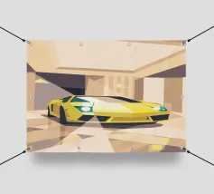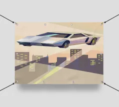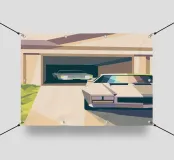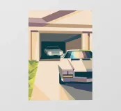 Illustrazione di due auto in un garage con uno stile geometrico moderno.