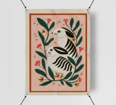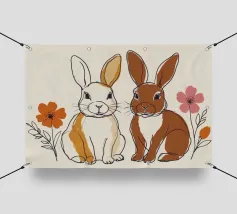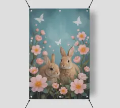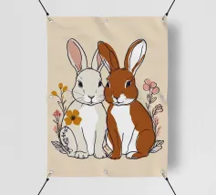 Due coniglietti pasquali stilizzati tra fiori colorati, pulcini e farfalle: un motivo allegro in stile poligonale, ideale per il periodo pasquale e l'inizio della primavera.