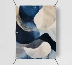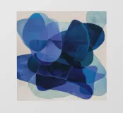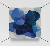 Un dipinto astratto composto da forme stratificate, traslucide e arrotondate in varie tonalità di blu profondo, che creano un profondo senso di profondità e di calma serena ed echeggiante.