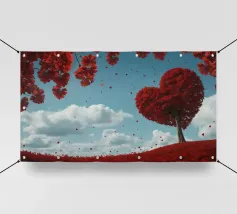 Un escavatore giallo è posizionato accanto a una benna rossa piena di oggetti a forma di cuore, che simboleggiano l'amore. L'ambientazione è caratterizzata da un terreno soffice, che aggiunge un tocco unico al tema di San Valentino.