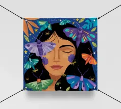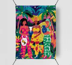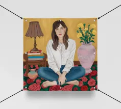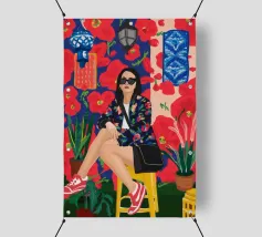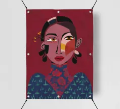 Questo dipinto raffigura una persona con i capelli neri che indossa un abito colorato con forme geometriche. Lo sfondo è rosso e la persona è adornata con grandi orecchini circolari.