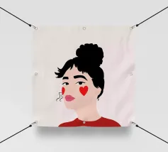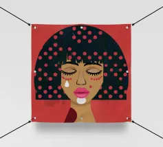Questo dipinto raffigura una persona con i capelli scuri acconciati in due chignon, che indossa grandi orecchini arancioni. Il volto della persona è dipinto con audaci motivi rossi e bianchi, mentre lo sfondo è di colore rosso pieno.