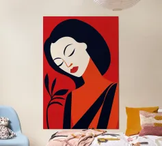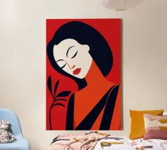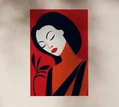 Questa elegante illustrazione mostra una donna misteriosa con occhi chiusi e labbra rosse su uno sfondo rosso brillante. Lo stile minimalista ricorda i dorati anni Venti e i ritratti glamour di Tamara de Lempicka. La palette di colori ridotta di nero, bianco e rosso esalta l'effetto drammatico, mentre le forme geometriche respirano pura estetica Art Déco. Un pezzo senza tempo dal fascino vintage, perfetto per gli amanti dell'eleganza classica e del minimalismo moderno. Aggiunge classe e mistero a qualsiasi ambiente.