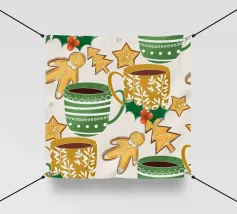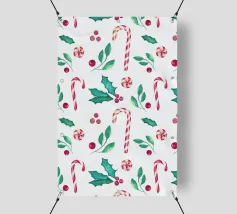 Un affascinante disegno natalizio senza cuciture con adorabili pettirossi che indossano cappelli da Babbo Natale appollaiati su rami di agrifoglio con bacche rosse brillanti. Il delizioso disegno incorpora elementi classici delle festività, tra cui campanelle dorate con fiocchi rossi, bastoncini di zucchero nelle tradizionali strisce rosse e bianche, allegri biscotti a forma di omini di pan di zenzero, pigne naturali e delicati fiocchi di neve sparsi su un morbido sfondo color crema.