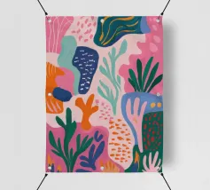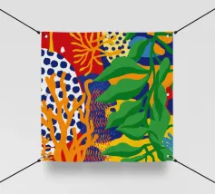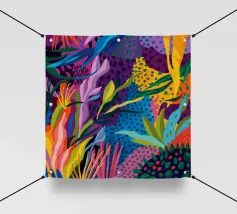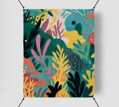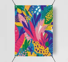 Una composizione astratta alta e stretta, piena di forme e motivi di foglie colorate sovrapposte, che suggerisce una fetta vibrante di una fitta giungla verticale.
