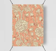Bellissima stampa floreale con fiori di camelia bianchi e foglie verdi, su uno sfondo color pesca.