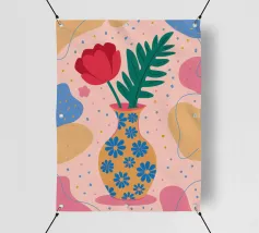 Ravvivate la vostra casa con questo moderno motivo floreale. Il vaso stilizzato in rosso e rosa, circondato da foglie blu e fiori delicati su uno sfondo azzurro, conferisce a questo disegno un aspetto grafico e contemporaneo. Ideale per decorazioni murali, cuscini, tazze, cover per cellulari e molto altro ancora. Questo motivo è perfetto per chi ama i disegni giocosi e colorati con un tocco di arte e modernità. Crea accenti vivaci e si adatta a un'ampia varietà di stili di interni.