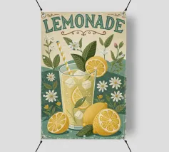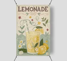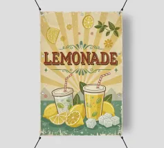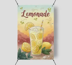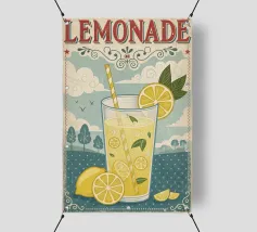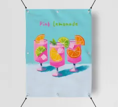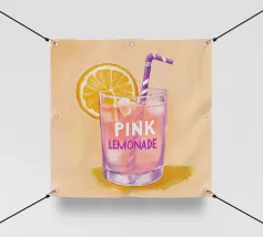 Una lattina di "Pink Lemonade" è illustrata in un vivace stile pop art, completa di condensa, cannuccia spumeggiante, fetta di limone fresco e fragola.