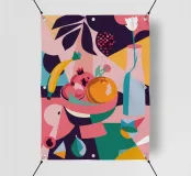 Una natura morta astratta giocosa e colorata con forme decostruite che rappresentano frutta, foglie e vasi. La composizione energica e la tavolozza vivace creano un'interpretazione gioiosa e moderna di un tema classico.