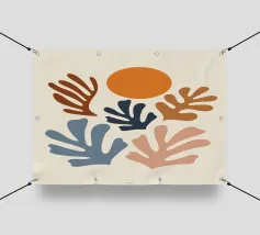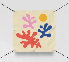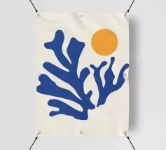 arte botanica astratta, forme moderne di piante, foglie di corallo rosa, illustrazione del sole arancione, sfondo blu pastello, design floreale minimalista, natura astratta contemporanea, grafica fogliare giocosa, opera d'arte dalle forme audaci, stampa ispirata a Matisse, atmosfera moderna tropicale, flora astratta vibrante